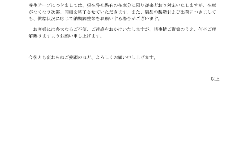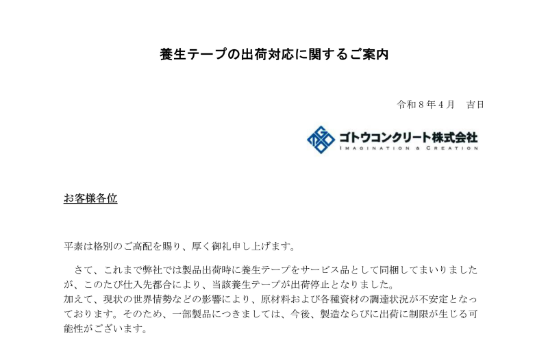 弊社では、これまで製品出荷時に養生テープをサービス品として同梱してまいりましたが、この度仕入先都合により、当該養生テープが出荷停止となりました。