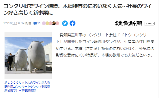 弊社が開発したワイン醸造・貯蔵コンクリートタンク「まゆ型コンクリートタンク」が、本日(12/10)読売新聞オンラインに紹介されました。